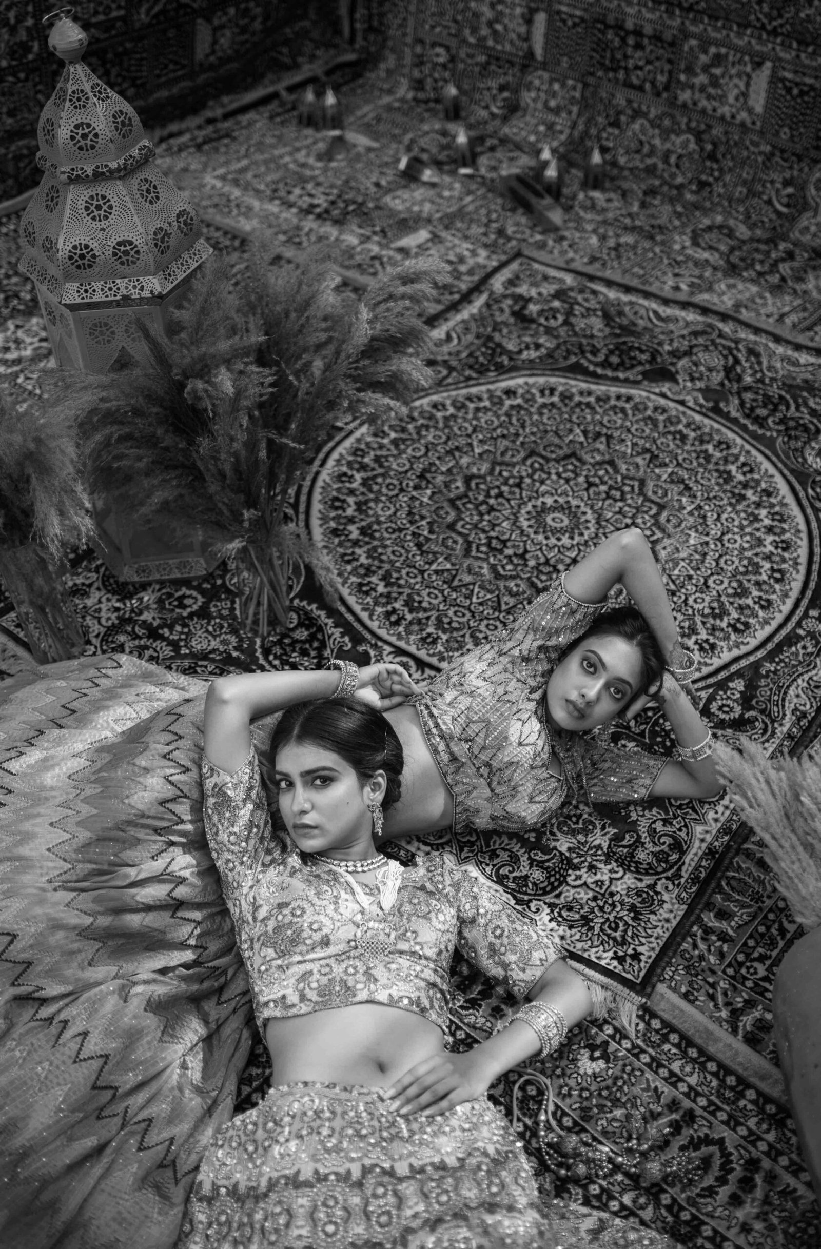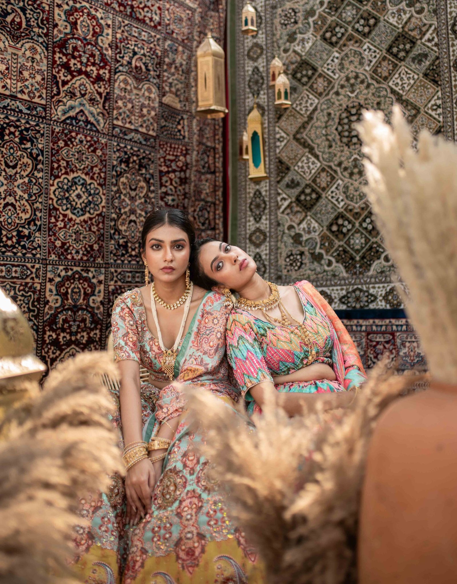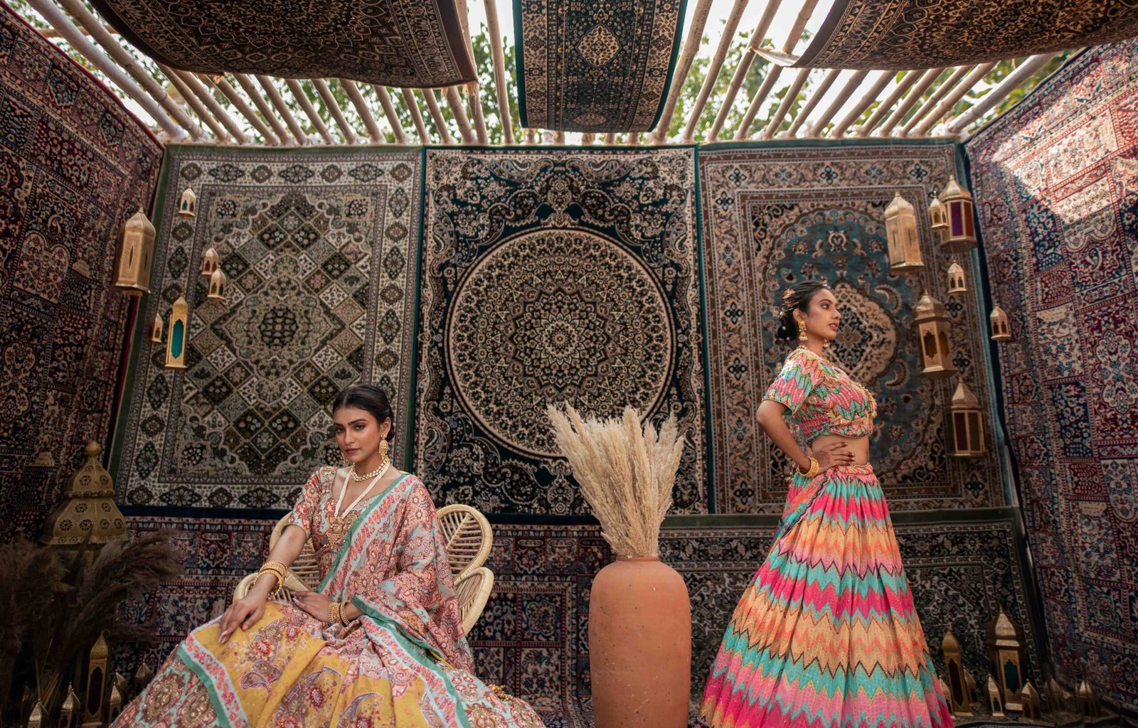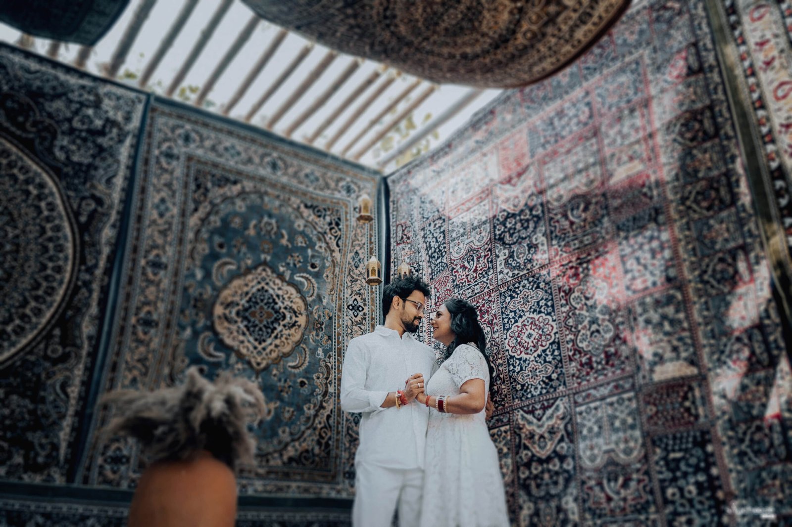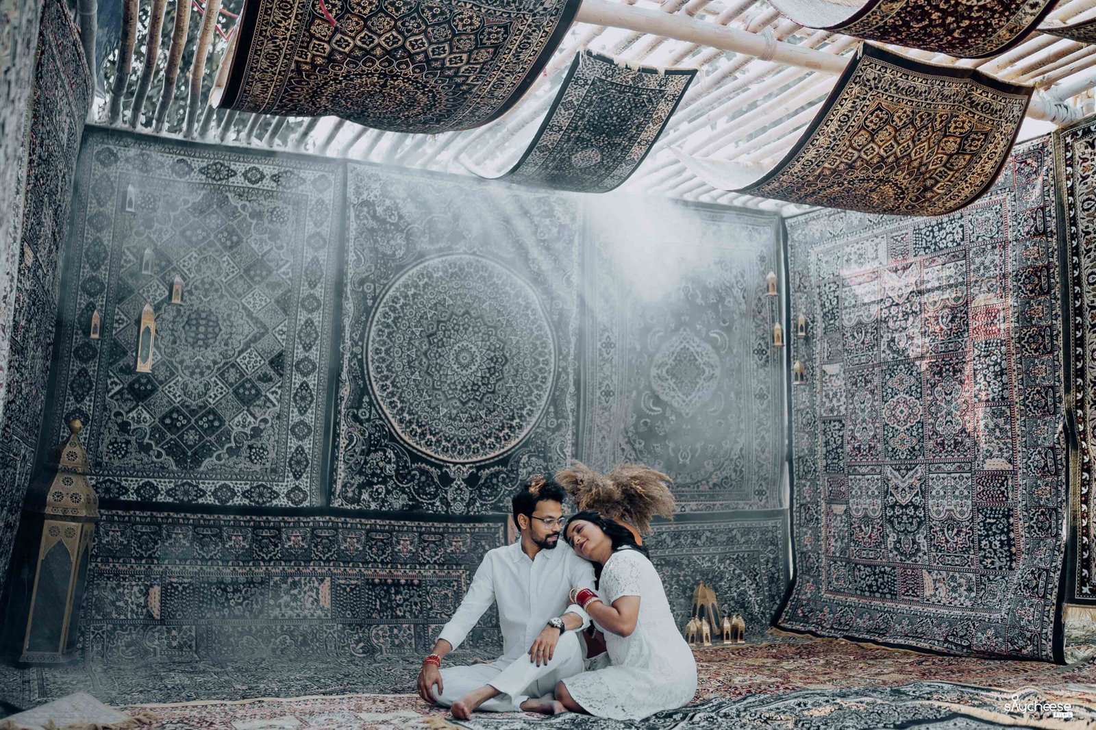 A cozy, luxurious setup with layered carpets and soft lighting, ideal for intimate, bohemian-inspired shoots.