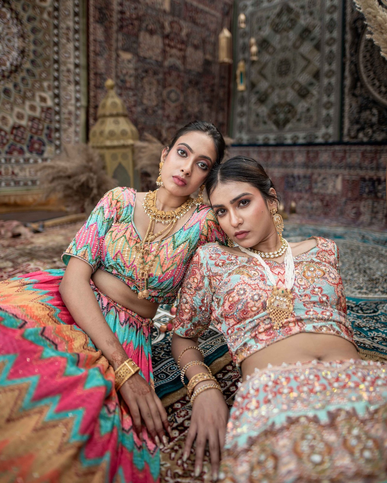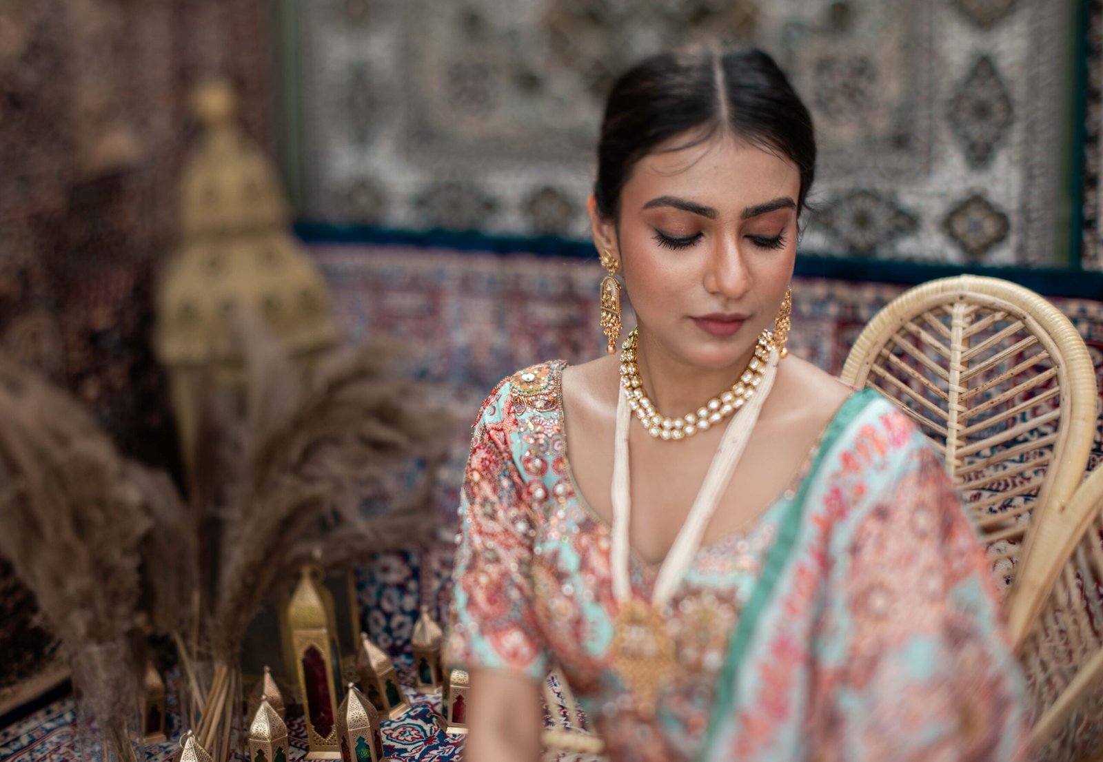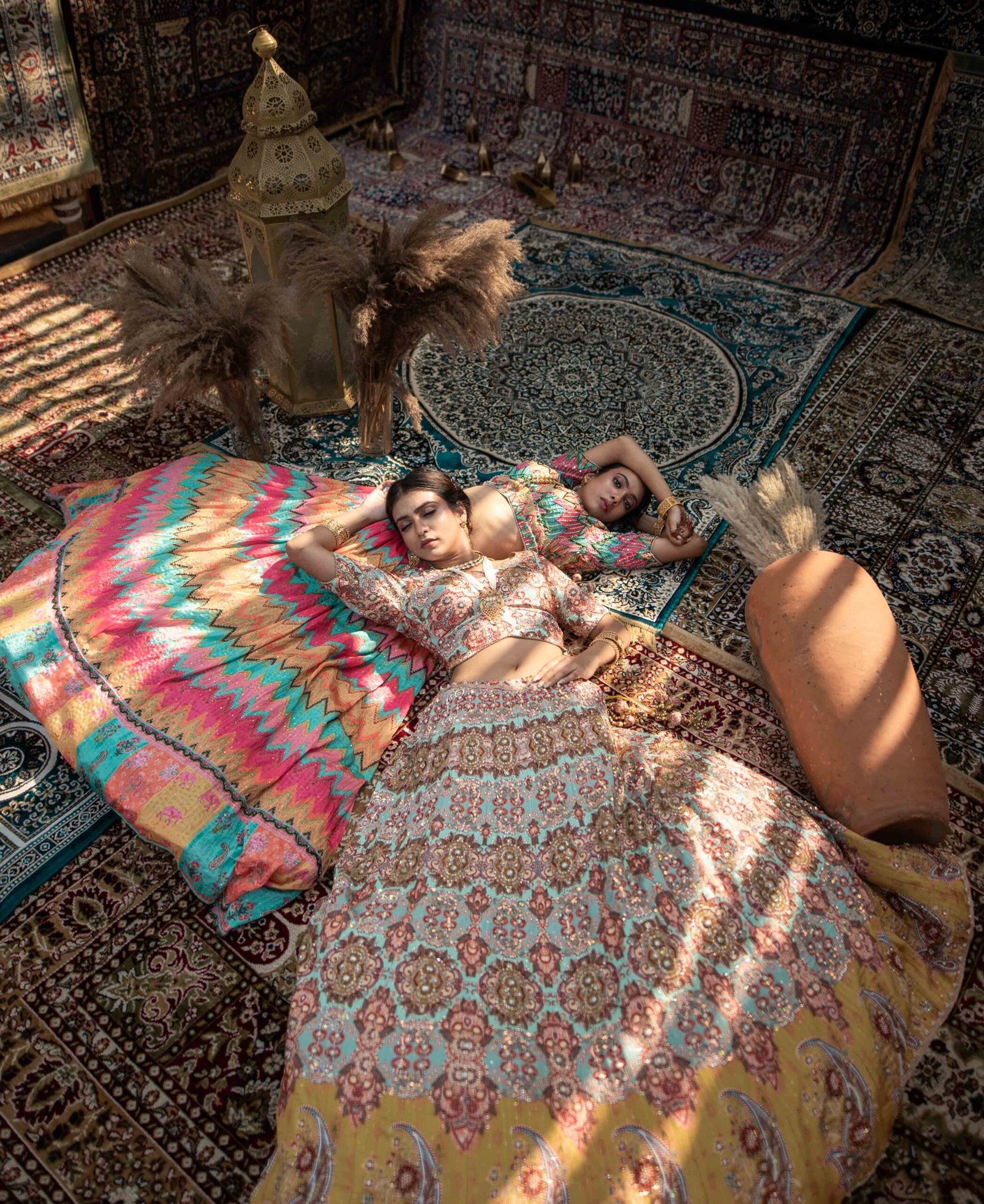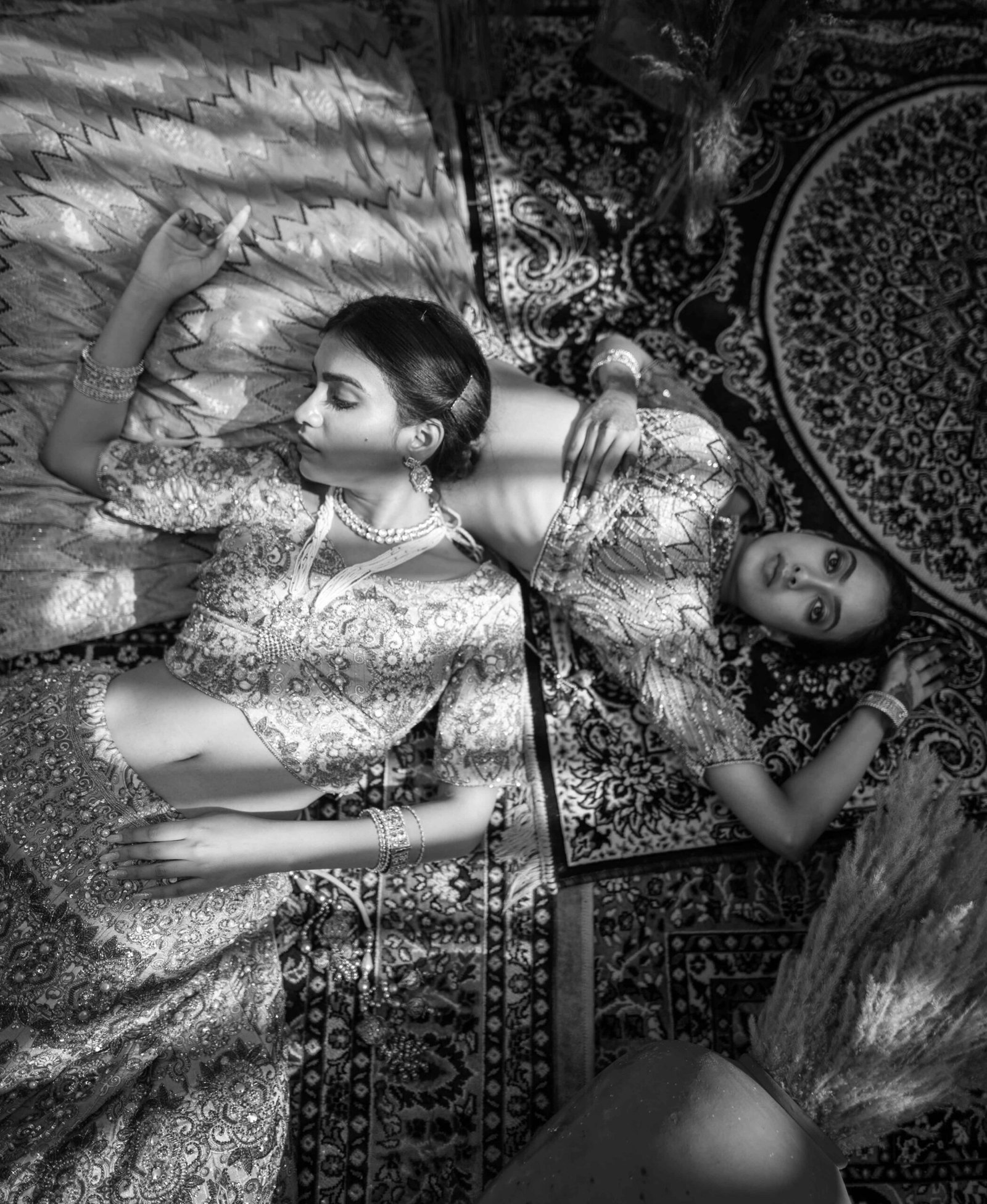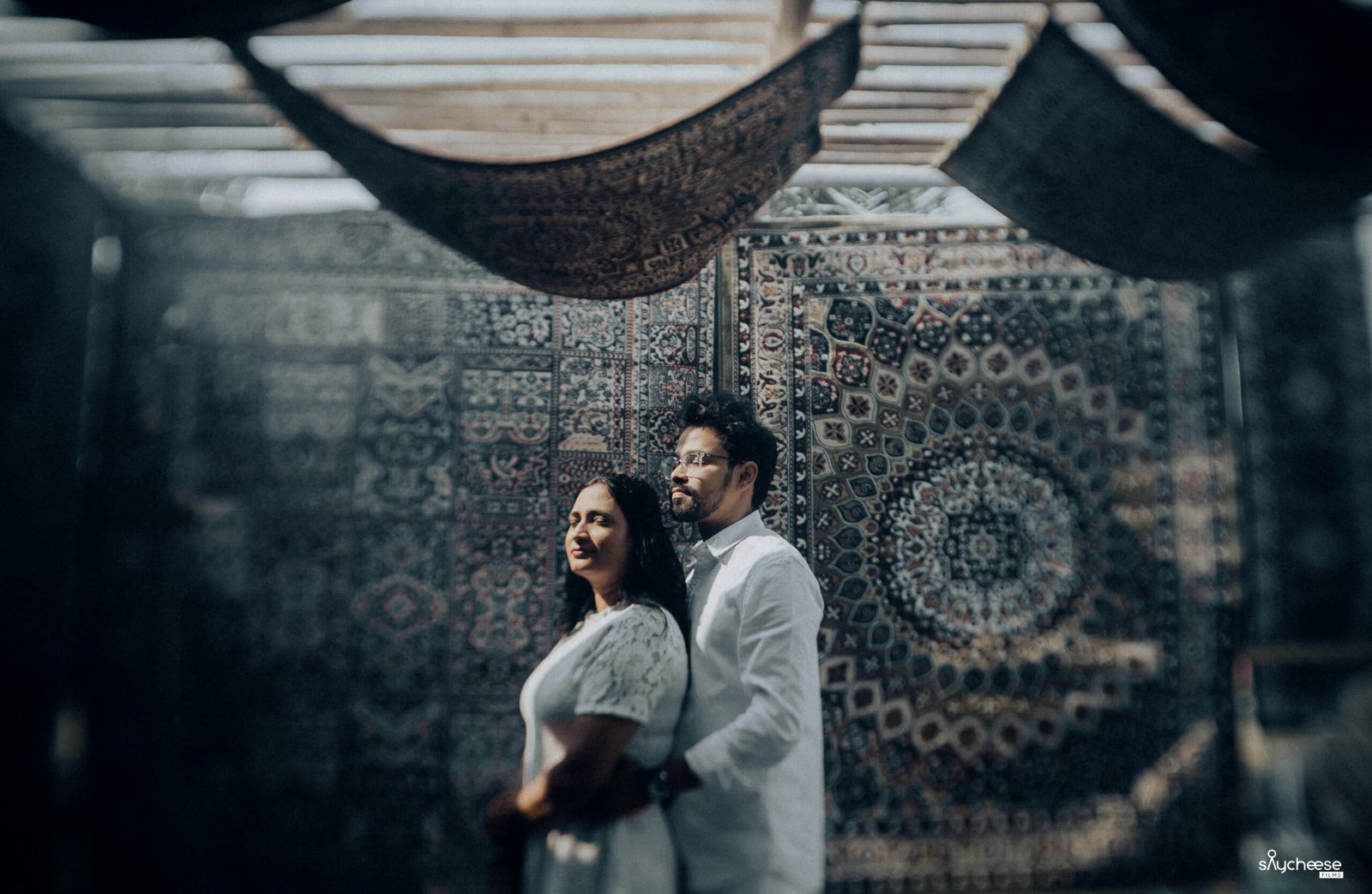 A cozy, luxurious setup with layered carpets and soft lighting, ideal for intimate, bohemian-inspired shoots.