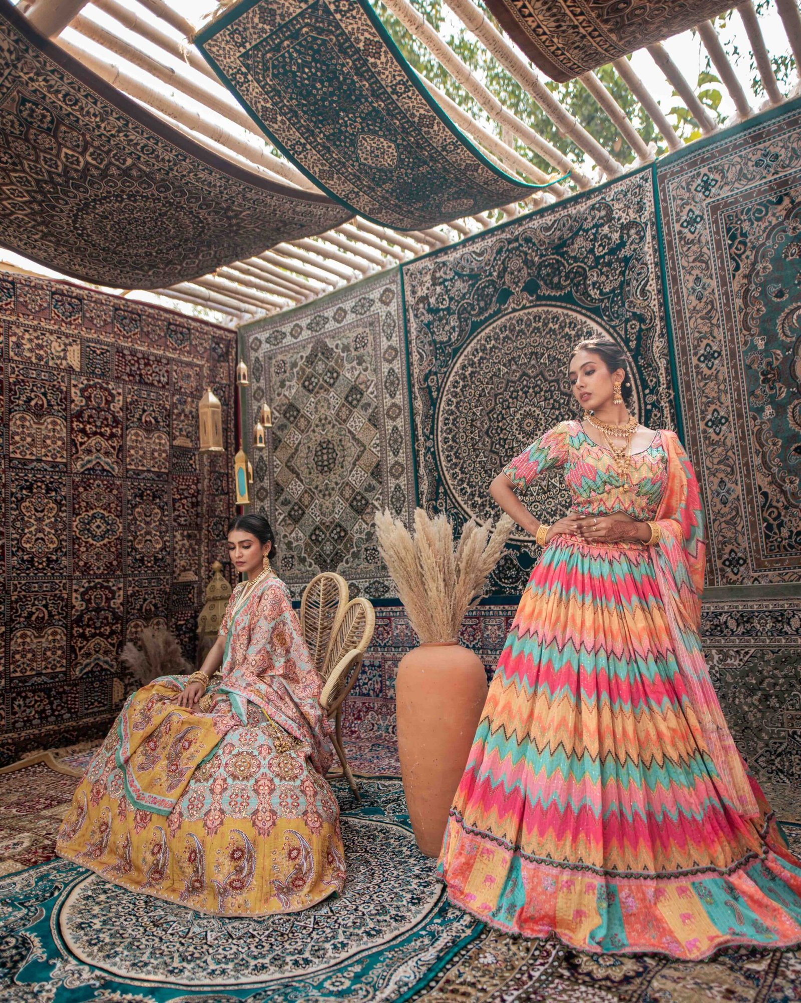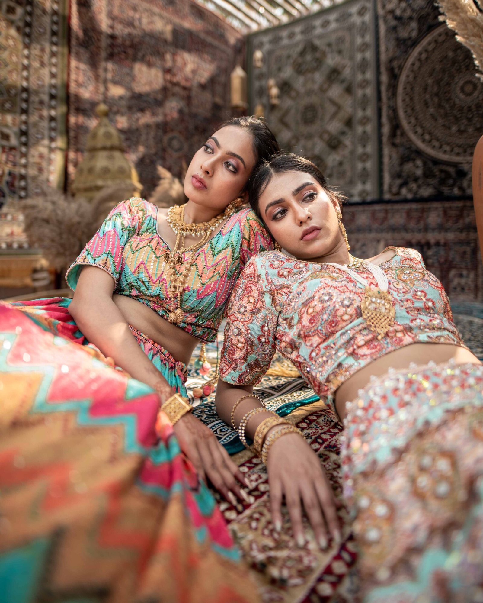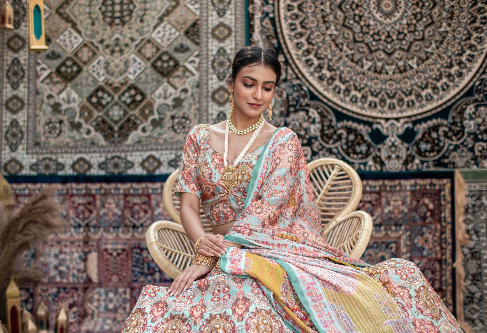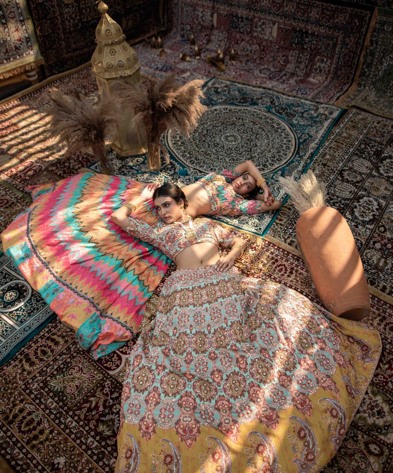 A cozy, luxurious setup with layered carpets and soft lighting, ideal for intimate, bohemian-inspired shoots.